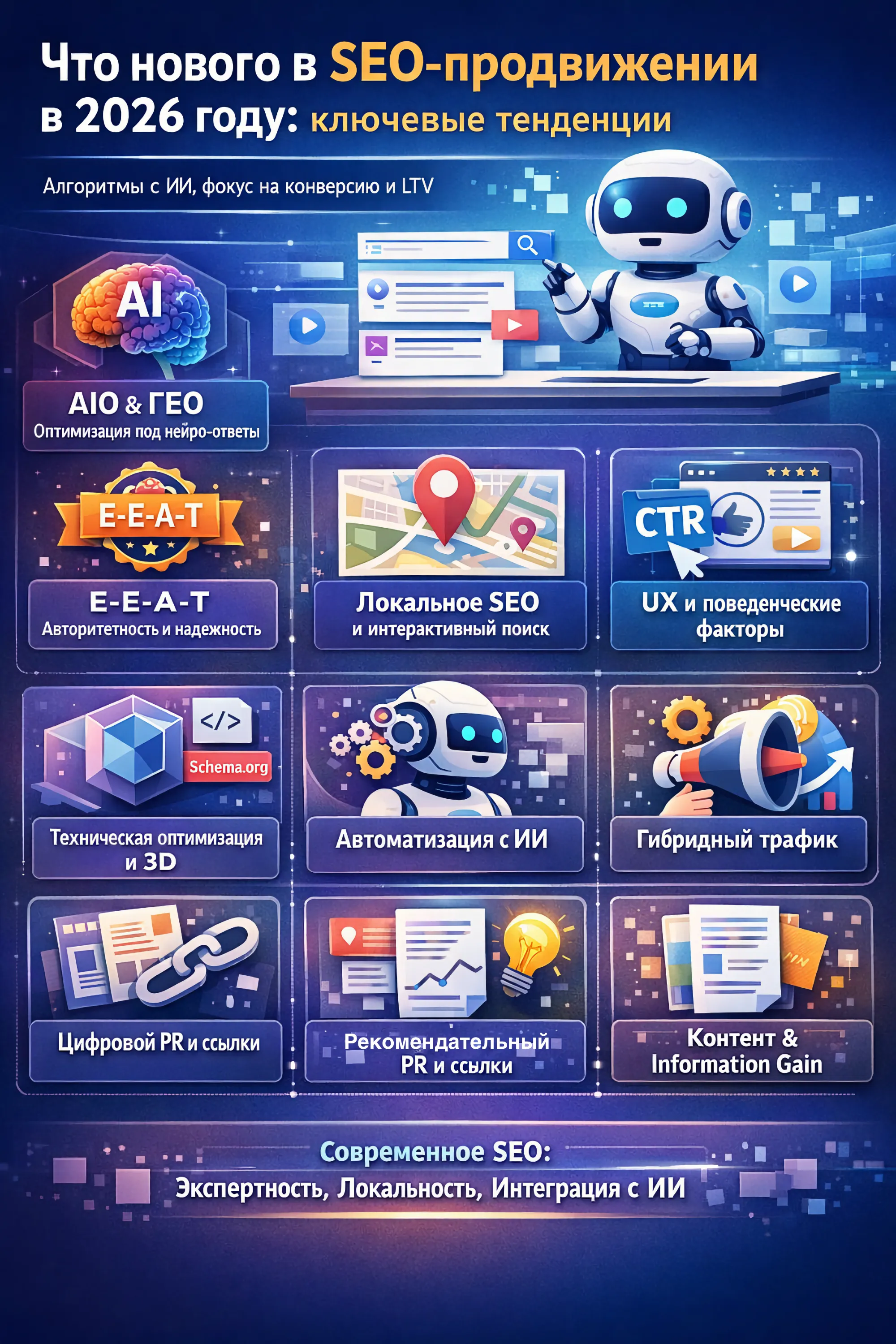 Итог: SEO в 2026 году — это не просто трафик, а комплексная стратегия, объединяющая техническую безупречность, экспертный контент, локальную видимость и интеграцию с ИИ. Успех зависит от доверия пользователей и алгоритмов, а также от способности адаптироваться к новым форматам выдачи.